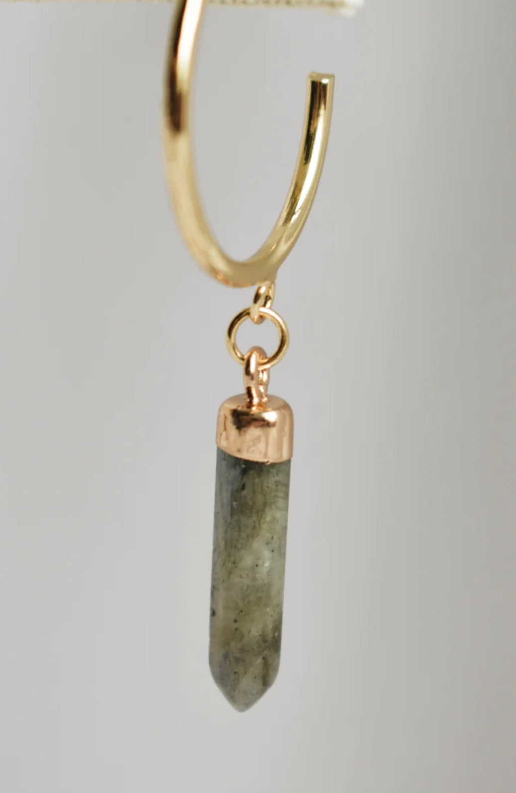 Stunning gold hoop earrings with mesmerizing labradorite pendants. These gold-plated hoops are a glamorous statement piece that will elevate any outfit.