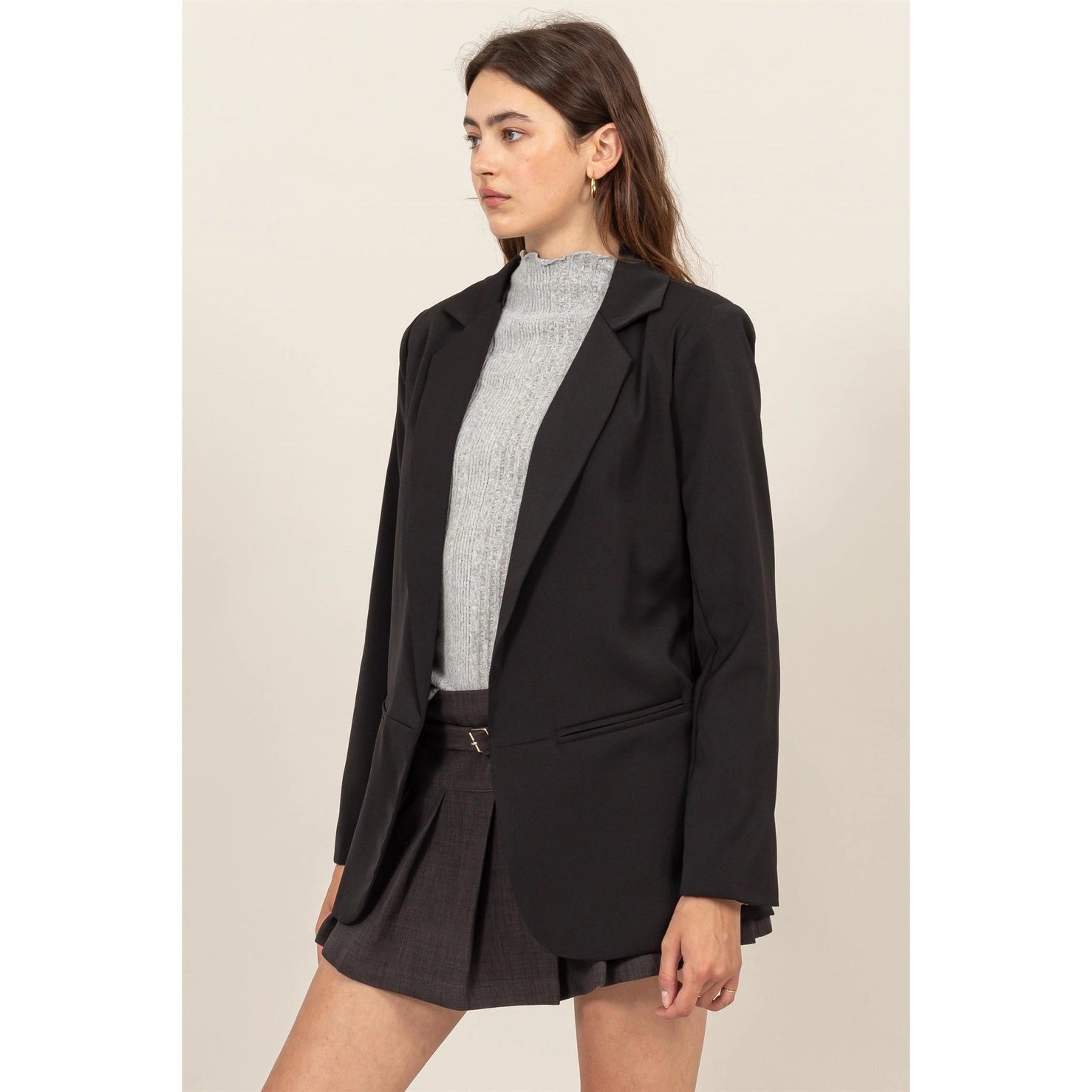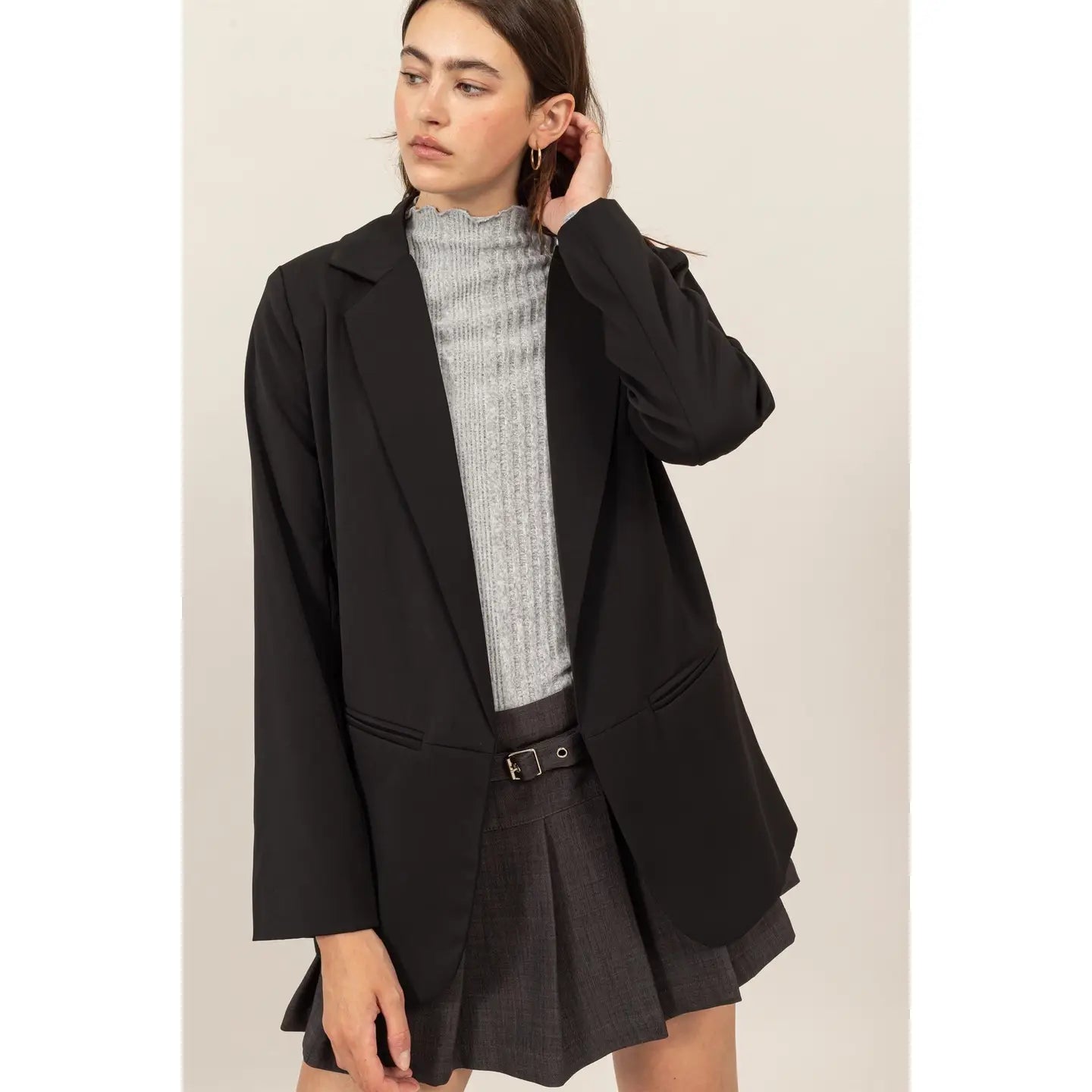 THIS LONG SLEEVE OPEN FRONT BLAZER IS A TIMELESS PIECE PERFECT FOR ELEVATING ANY OUTFIT. DESIGNED WITH A CLEAN, TAILORED FIT, IT FEATURES A SLEEK OPEN FRONT, NOTCHED LAPELS, AND FUNCTIONAL SIDE POCKETS. THE SMOOTH FABRIC AND STRUCTURED SILHOUETTE MAKE IT AN IDEAL CHOICE FOR BOTH PROFESSIONAL AND CASUAL OCCASIONS.